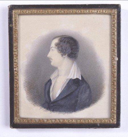 Suorakaiteen muotoinen miniatyyri. Miehen rintakuva vasemmalle, pää profiilissa. Ruskeat, kiharat hiukset, pienet viikset. Sininen takki, valkoinen paita edestä auki. Harmaa tausta. Kuvan päällä lasi, kehyksenä lasin reunoille liimattu, osin musta, osin kullan värinen paperi.