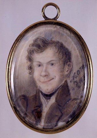 Soikea miniatyyri. Nuoren miehen rintakuva, vartalo vasemmalle. Eloisat hymyilevät kasvot, ruskeat kiharat hiukset ja harmaat silmät. Ruskea takki, valkoinen liivi jossa kullanväriset napit, musta kaulaliina. Harmaanruskea tausta. Kullattu hopeakehys jossa ripustuslenkki. Lasi. Miniatyyrissä ei ole ollut kehystä kun se on saatu kokoelmiin.