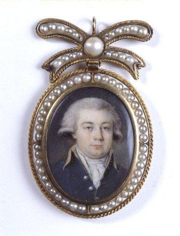 Soikea miniatyyri. Keski-ikäisen miehen rintakuva oikealle. Puuteroidut hiukset, siniset silmät.Tummansininen takki, korkea kaulus, keltaiset kauluskäänteet. Hopeanväriset napit. Valkoinen liivi, paita ja kaulaliina röyhelöineen. Tummanharmaa tausta. Kullattu soikea kehys, ja rusetti jossa ripustuslenkki ja -rengas. Kehyksessä ja rusetissa helmiä. Kääntöpuolella hiuksista punotulla taustalla kultakirjaimin monogrammi JW. Miniatyyrin ja kääntöpuolen päällä lasit.