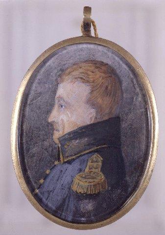 Soikea miniatyyri. Vanhahkon miehen rintakuva profiilissa vasemmalle. Harmaat silmät, vaaleanruskeat eteenpäin kammatut lyhyet hiukset. Sininen univormu, kullanväriset napit, koristeet ja epoletit. Harmaansininen tausta. Kapea kullattu metallikehys jossa ripustuslenkki. Miniatyyrin päällä lasi. Kääntöpuolella lasin alla kuviollista silkkikangasta.