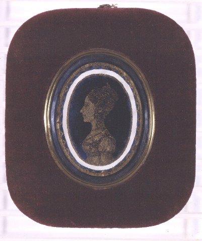 Soikea miniatyyri/siluetti. Naisen rintakuva profiilissa vasemmalle. Mustalla pohjalla kullanvärinen siluetti, johon hiukset, kasvonpiirteet ja puvun yksityiskohdat piirtyvät mustina. Pitkät, ylös nutturalle nostetut hiukset, ohimoilla kiharat. Lyhythihainen, avonainen puku. Rinnassa kukka (?), kaulassa kaksinkertainen helminauha. Soikeaa kuvaa reunustaa mustalla ja kullalla tehty koristereunus. Messinkikehys kuvan ympärillä. Uloimpana tummanpunaisella sametilla päällystetty puukehys.