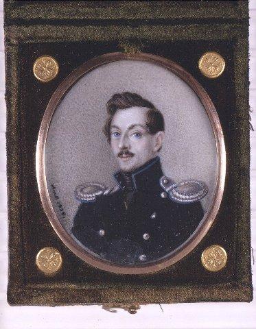 Soikea miniatyyri. Miehen rintakuva, vartalo vasemmalle. Tummanruskeat lyhyet hiukset ja viikset, siniset silmät. Suomen kaartin univormu: tummanvihreä takki, hopeiset napit ja epoletit, siniset kanttaukset. Musta kaulaliina. Vaaleanharmaa tausta. Kapea metallikehys (kuparia?). Miniatyyrin päällä lasi. Nahkakotelo jossa vihreä samettivuoraus. Kotelossa on syvennys miniatyyriä varten. Miniatyyrin ympärillä kotelossa neljä messinkiruusuketta.
