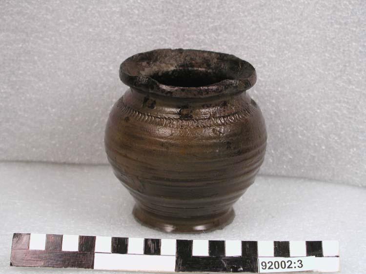 Pulleavatsainen keramiikkaruukku. Suureuna muotoiltu "neliapilan" malliseksi. Ruukku on leikattu irti dreijasta. Astian kylkiosassa loiva rihlauskoristelu. Astian yläosassa, olan yläpuolella rullaleimalla tehty pykäläviivakoristelu. Esineen konservointi on yhä kesken.