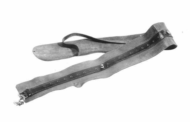 Ruskeasta nahasta tehty vyö. Vyön keskelle on koko sen pituudelta kiinnitetty kapea, mustasta kiillenahasta tehty vyö, jossa soljen lisäksi on koristeena kuparisia "kynänsilmiä" ja kuparinastoja. Vyön nurjalla puolella on toinen kapeampi vyö, jonka avulla vyön päät kiinnitetään.