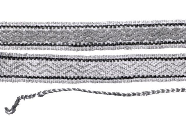 Nauhapirralla kudotut paulat. Villaa, värit: punainen, harmaa, tummanruskea ja sininen. Paulan päät letitetty.