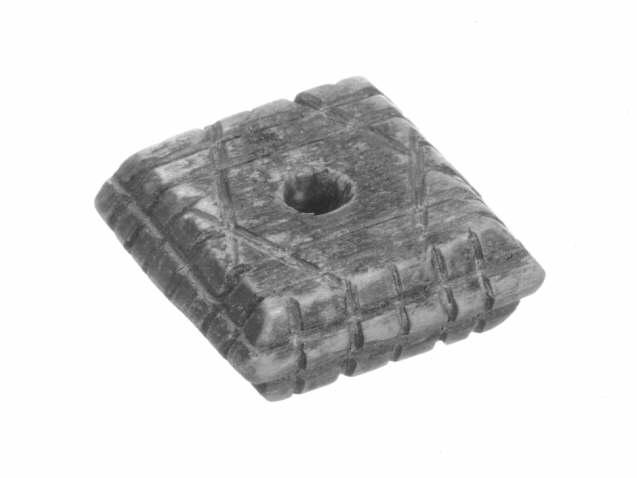 Nelikulmainen, sivuiltaan profiloimalla koristeltu värttinäpyörä.