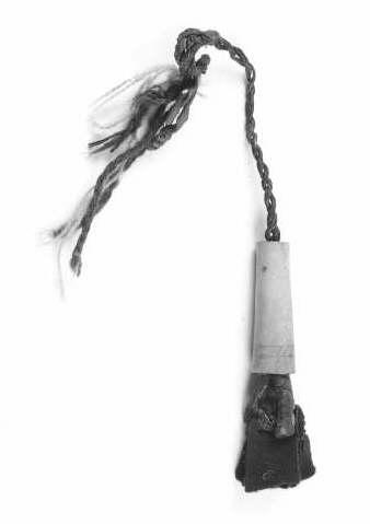 Nahkahihnaan pujotettu sarvinen neulakota. Nahkahihna levenee alapäästään siten, että se estää sarviputkea valahtamasta pois hihnasta.