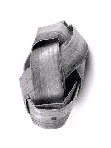 Keränpohjallinen, sormenlevyisistä päreistä nidottu, pitkulaisen pallon muotoinen, sisällä rapisemassa puunoppa.Uusi.
