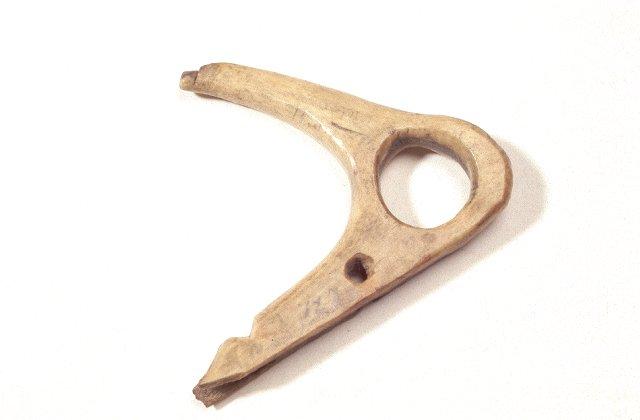 Hihnakoukku, haarukan muotoinen, tyvessä iso reikä, toisessa sakarassa pykälä ja reikä.