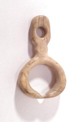 Kaksi suopunginrengasta, yhdistetty toisiinsa n. 10 cm:n pituisella nahkanyörillä. Ne ovat arvatenkin mukana pidettäviä vararenkaita. Rengasosaan raaputettu toiselle puolelle joitakin kirjaimia ja merkkejä.
