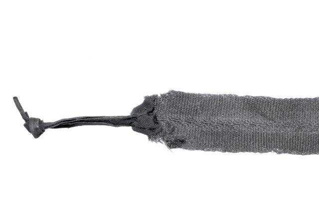 Nauhapirralla kudottu paula. Värit punainen ja vaaleansininen. Toisessa päässä käsissä isketty nauha, toisessa nahkasilmukka.