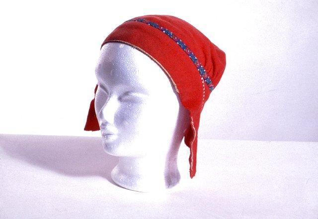 Naisen lakki, korvuksien alalaidat kuluneet ja lyhennetty leikkaamalla. Materiaali heleänpunaista verkaa. Lakissa kapeahko sinipohjainen koristenauha (hervanauha) ja korvuksessa alas juokseva punakuvioinen valkopohjainen ohu nauha ja etureunassa kapea valkea polvekenauha; koristelu siis utsjokelaista tyyppiä. Lakki edustaa Utsjoen mallin lapinnaisen lakkia 1950-luvulta.