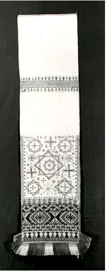 Pitkä kapea luonnonvalkoinen palttinasidoksinen puuvillakudonnainen, jonka päissä ja keskellä kahdessa kohdassa on kirjontavyöhykkeet. Geometrisaiheinen ristipistokirjonta on ommeltu punaisella ja vihreällä puuvillalangalla. Päissä kirjonta lähes peittää pohjakankaan. Sitä seuraavassa vyöhykkeessä on kaksi päällekkäistä kahdeksansakaraista tähteä, sekä pieniä irrallisia kuvioita. Ne ovat myös punaisia ja vihreitä, mutta etupistoin kirjottuja. Päissä on punainen, vihreä ja keltainen puuvillanyörihapsutus. Kahdeksansakaraisen tähden on uskottu suojaavan pahalta silmältä. A.O.L. nro 131b
