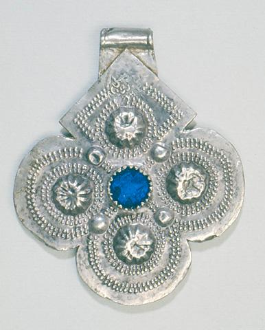 Ristin muotoinen amulettiriipus (arab. fuläts khamsa), joka on valmistettu kahdesta toisiinsa juotetusta hopealevystä. Toiselle puolelle keskelle on istutettu pyöreä sininen lasinpala. Sitä ympäröi kolme erikokoista neljän kohouman ryhmää. Reunoja ja suurimpia kohoumia kiertää kaksinkertainen pienistä nystyröistä muodostuva linja. Kuvio toistuu toisella puolella, mutta lasipalan tilalla on pakotettu kohouma. Värillisellä lasilla jäljitellään arvokkaita kivilajeja, ja se saa värinsä palan alle laitetusta paperista. Keskusta ja sen ympärille ryhmittyvät kolme erikokoista neljän ryhmää muodostavat kolminkertaisen viitoskuvion, khamsan. Sen sekä sinisen värin on uskottu suojaavan esinettä ja omistajaa pahalta silmältä. A.O.L. nro 131b
