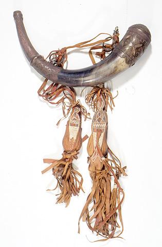 Ruutisarvi (berb. isk lbarud), joka on valmistettu harjalampaan (lat. Ovis tragelaphus/Ammotragus lervia;berb. udad/aoudad) tummanruskeasta sarvesta. Kiillotetun sarven molemmat päät on päällystetty messingillä ja koristeltu kauttaaltaan etupuolelta siselöidyin yksinkertaisin nelilehtisin kuvioin. Takapuolelle on uurrettu ruutupinta; osassa ruuduista on keskellä risti. Pinta on takaa osin patinoitunut. Kahteen suureen renkaaseen on pujotettu yhteen sidotut nahkaiset luotipussit (berb. lemsarir, yks. lemsar tai Korkea-Atlaksessa askumas, yks. askums). Pussit on koristeltu ohuilla nahkakaistaleilla kirjotuin geometrisin kuvioin, ja niiden päissä roikkuvat pitkät tupsut. A.O.L. 131a