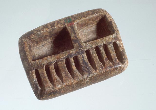 Vihertävänharmaasta kivestä karkeasti veistetty litteä suorakulmainen öljylamppu. Toiselle laidalle on hakattu öljysäiliöt, toinen suorakulmainen ja toinen neliön muotoinen. Toisella laidalla ovat urat (9kpl) lampun sydämiä varten. Aivan reunaan säiliöiden viereen on kaiverrettu rivi rasteja. Pinta on paikoin tummunut. A.O.L. nro 131a