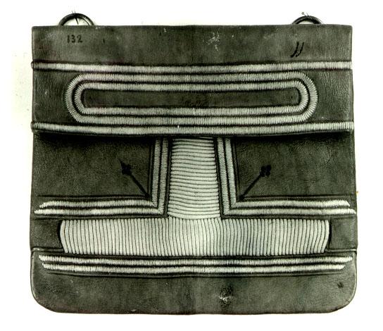 Ruskeasta nahasta ommeltu suorakulmainen laukku, jonka yläosa taipuu eteen läpäksi. Päällipuolelle on valkoisella - läpän alla punaisella - villalangalla kirjottu geometrinen kuviointi. Taakse yläreunaan on kiinnitetty metalliset lenkit. Niiden alapuolelle on kirjottu valkoisella, sinisellä ja vihreällä puuvillalangalla ornamenttikuviot. Kantohihna puuttuu. A.O.L. nro 131b