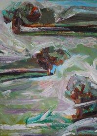 Yllätyin itsekin aiheen vaihtumisesta, kunnes huomasin, että siirtymä toiseen teemaan johtui aiemmin käyttämistäni muodoista. Pehmeät ja pyöreät pilvet johdattivat minut saarekkeiden lehvästömuotoihin. Aiemmissa teoksissani käyttämäni suorat paalut ovat siirtyneet uusiin töihin puunrunkoina.