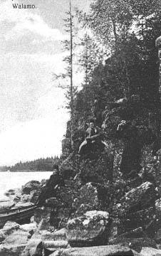 | postikortti: kaksi munkkia ja mieshenkilö kivikkoisella rantajyrkänteellä |