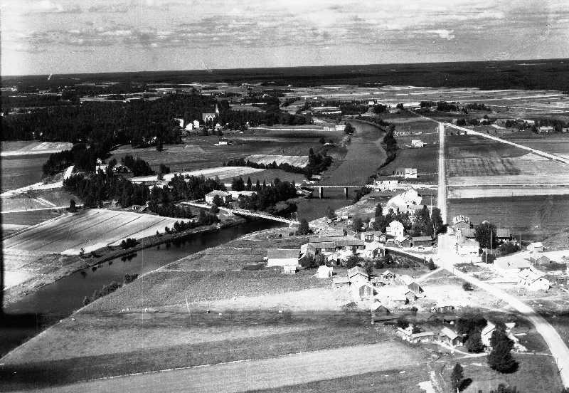 Lapuanjoen vie kaksi siltaa. Lähinnä kuvassa oleva on riippusilta joka purettiin pois v1960-luvun loppupuolella, Taaimmainen silta on rakennettu v 1960. Kuvassa takana vas, kirkko. Pirin kylä oikealla edessä.