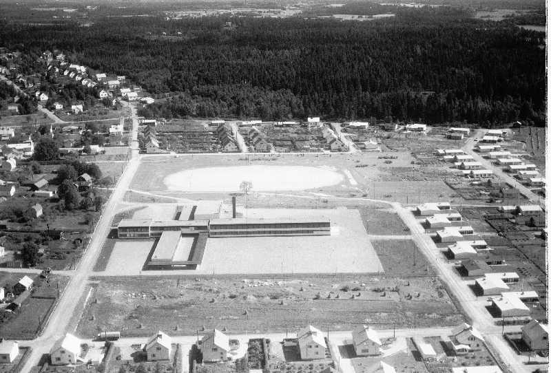 Vuonna 1966 valmistunut Lähemäen koulu kuvattuna lännestä päin. Vasemmassa reunassa kulkee Alakatu.