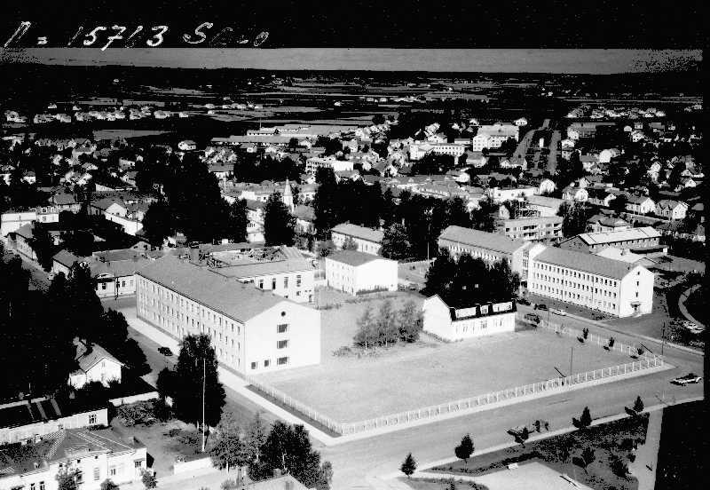 Salon Yhteislyseo pihoineen ja sen takana oikealla olevassa rakennuksessa oli posti (vasen pääty) ja poliisi (oikea pääty).