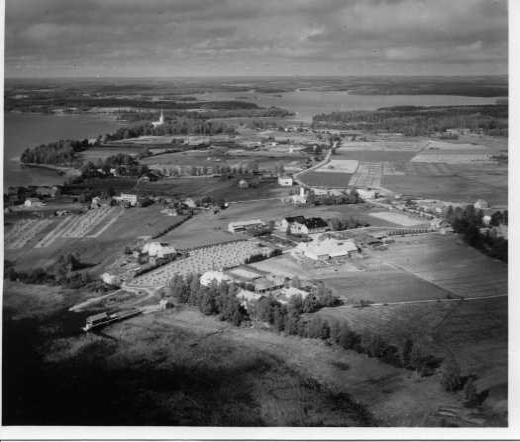 | ilmavalokuva: Pielavesi, kirkonkylää, maalaistaloja ulkorakennuksineen, peltoa, muutama liikerakennus, taustalla kirkko (Ferd |